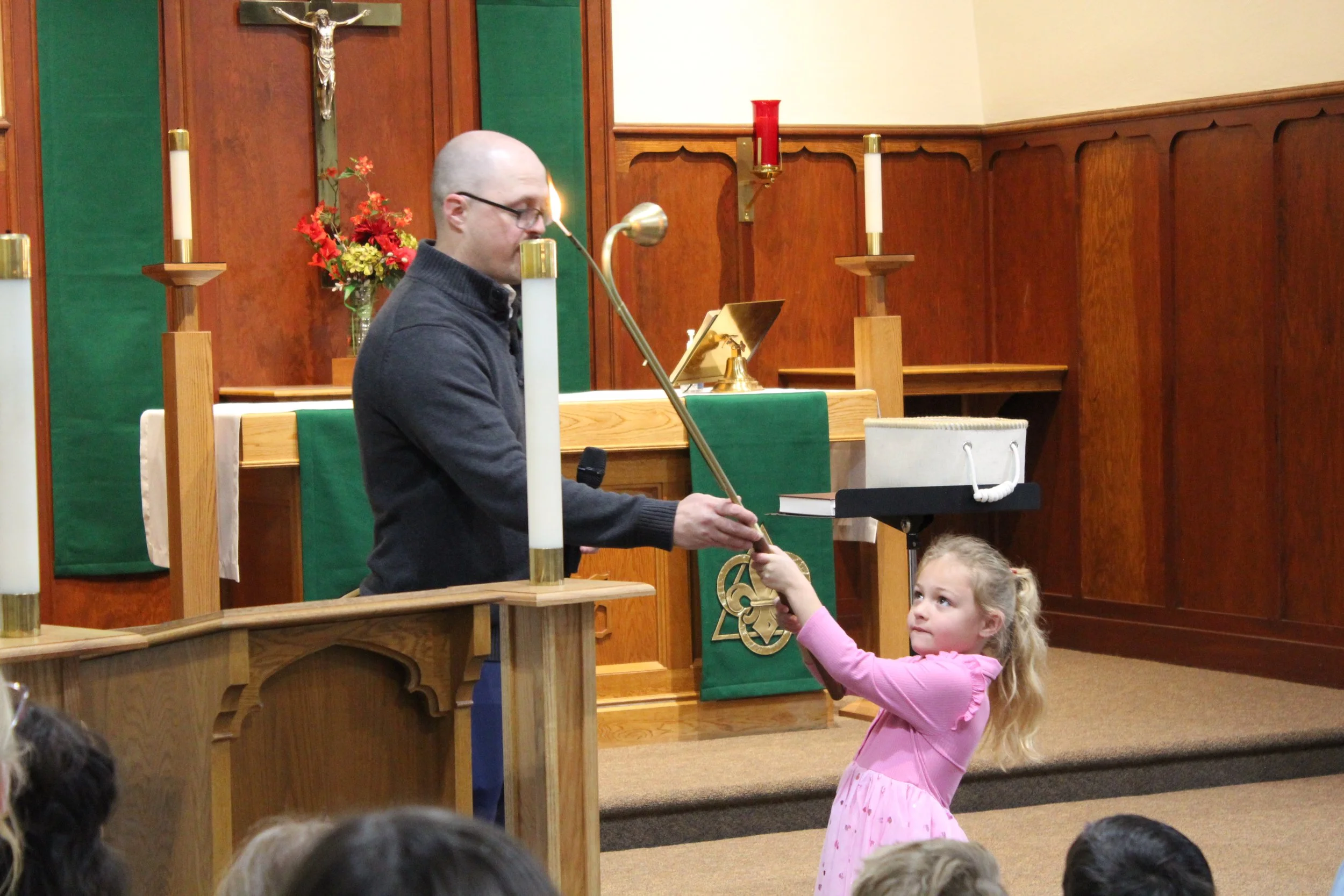 Chapel is held every Wednesday from 9:45–10:00 a.m. and is attended by the entire school community. Children from toddlers through Transitional Kindergarten participate in an engaging, age-appropriate program that includes Bible stories, learning the Lord’s Prayer, and singing children’s worship songs in a style similar to Vacation Bible School. Sign language is incorporated to enhance learning and participation. Families are always welcome and encouraged to attend chapel alongside their children.